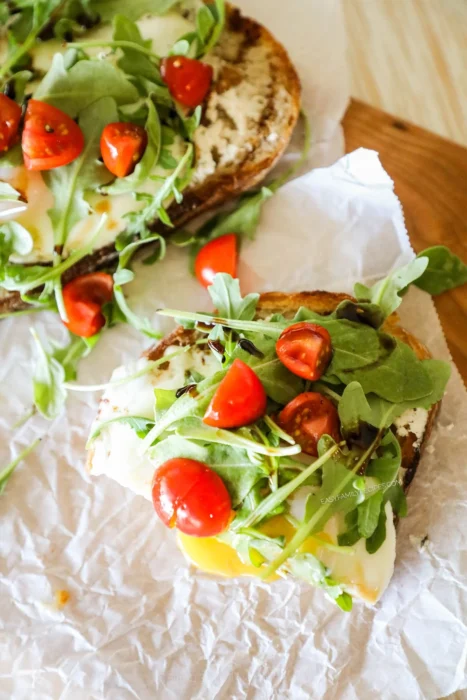 - Top with arugula, quartered cherry tomatoes, and a drizzle of balsamic glaze.