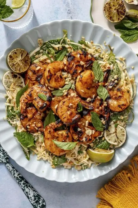 - Serve: Remove the grilled shrimp and grilled limes (if using) from the grill. Arrange the Thai herb slaw on a serving platter and top with the grilled shrimp. Squeeze the grilled limes over the shrimp and slaw. Garnish with chopped peanuts (if using). Serve immediately and enjoy!